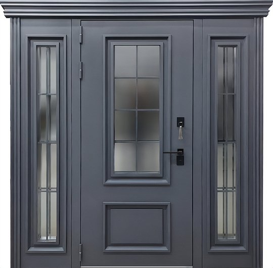 Входная остекленная группа с терморазрывом, металлобагетом, карнизом и покраской «графит» представляет собой удачное сочетание инженерной точности и дизайнерской проработки. За счёт применения надёжных компонентов дверь сочетается с различными стилями архитектуры и отделки.